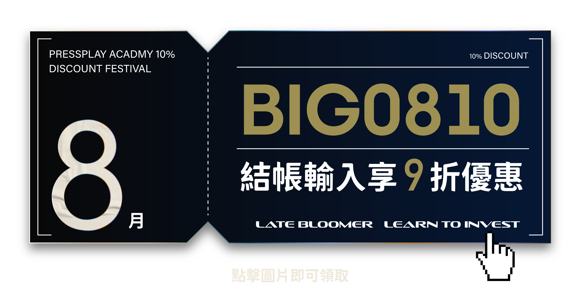 ⚠️ PressPlay Academy 保有折扣碼使用規定最終解釋與裁判權⚠️結帳時必須輸入BIG0810,購買本活動13堂課才享有9折優惠⚠️9折優惠券僅限本活動頁課程,使用期限截止日8/20⚠️此優惠券不支援於iOS APP內結帳使用⚠️8/10~8/11《投資癮的完整交易邏輯》已享有7折優惠結帳金額為3480元,不適用本次9折券。8/12《投資癮的完整交易邏輯》課程恢復原價4980元,方可適用本次9折優惠券。