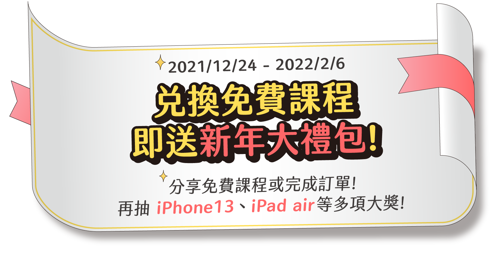 新註冊會員成功兌換課程,即獲得89折優惠券於12/24 前註冊成為會員者,獲得85折優惠券