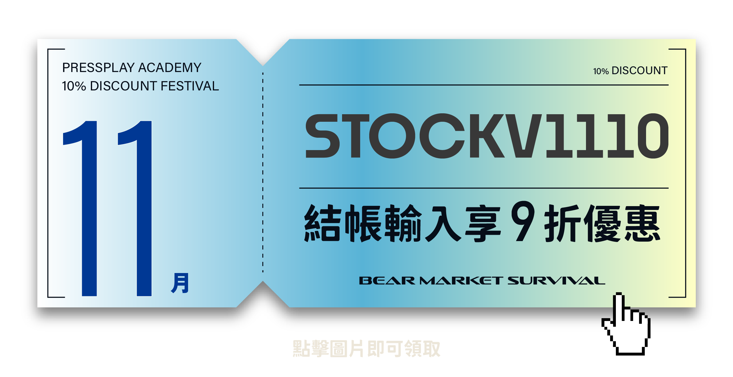 ⚠️ PressPlay Academy 保有折扣碼使用規定最終解釋與裁判權⚠️結帳時必須輸入STOCKV1110,購買本活動精選訂閱專案才享有9折優惠⚠️9折優惠券僅限本活動頁訂閱專案,使用期限截止日11/20⚠️此優惠券不支援於iOS APP內結帳使用。
