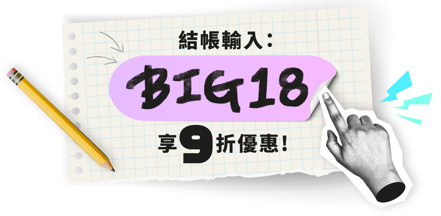 ⚠結帳時必須輸入BIG18,購買本活動指定精選課程或訂閱專案才享有 9 折優惠