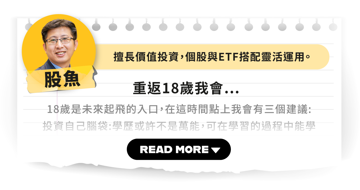 3. 善用年輕優勢:年紀大的人有錢、年紀輕的人有時間。在投資理財的世界中,時間就是金錢的表徵,透過時間複利的累積效果,在年輕時投入一筆資金就算不再作任何動作,隨著時間過去自然會累積出一筆財富。而18歲的年輕人,時間是站在你們這邊的,不要虛度浪費這寶貴的資源,將資金投入在ETF擁抱整個市場或是佈局在績優股上,當時間過去,一定會感謝年輕時的自己所埋下的財富種子!