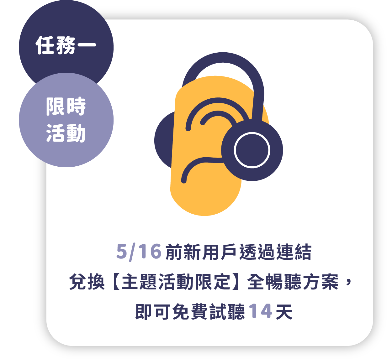 。新用戶依活動期間 2023/05/02 12:00 ~ 2023/05/16 23:59 ,兌換耳邊說書【主題活動限定】全暢聽方案使用。