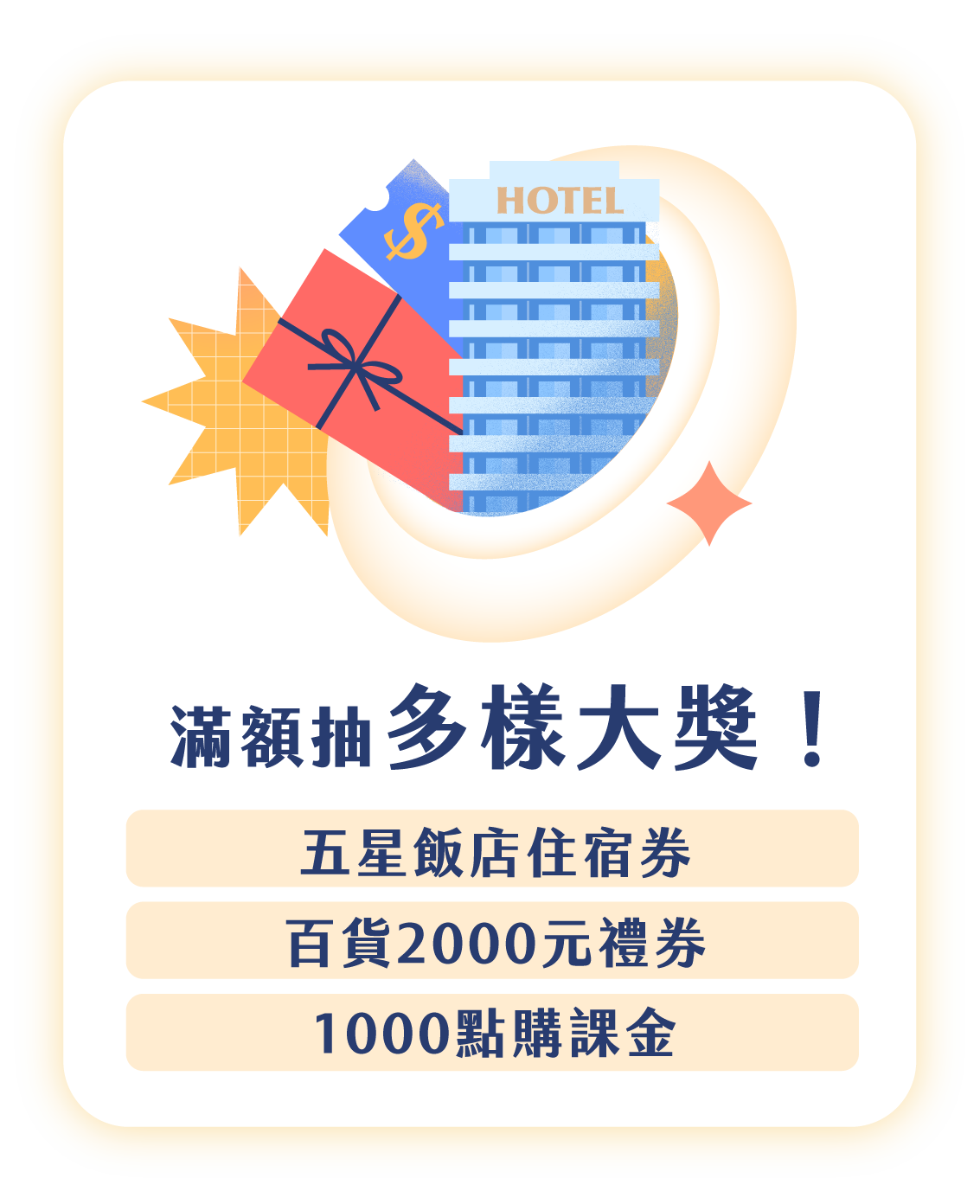 。滿額抽獎獎項包含台北大直英迪格酒店住宿券兩名、新光三越 2000 元禮券兩位、1000點購課金五位。