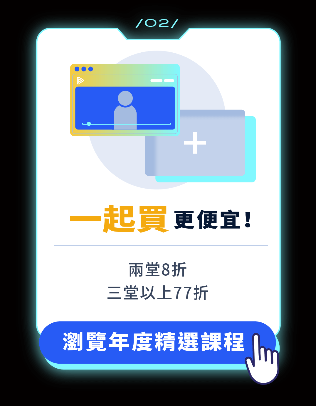 我們特別為你準備了三項好禮,不管是:精選 60 堂優惠課程、低至 77 折的合購組合,還是已經瞄準目標類別的限時分類優惠相信都能一次滿足你!