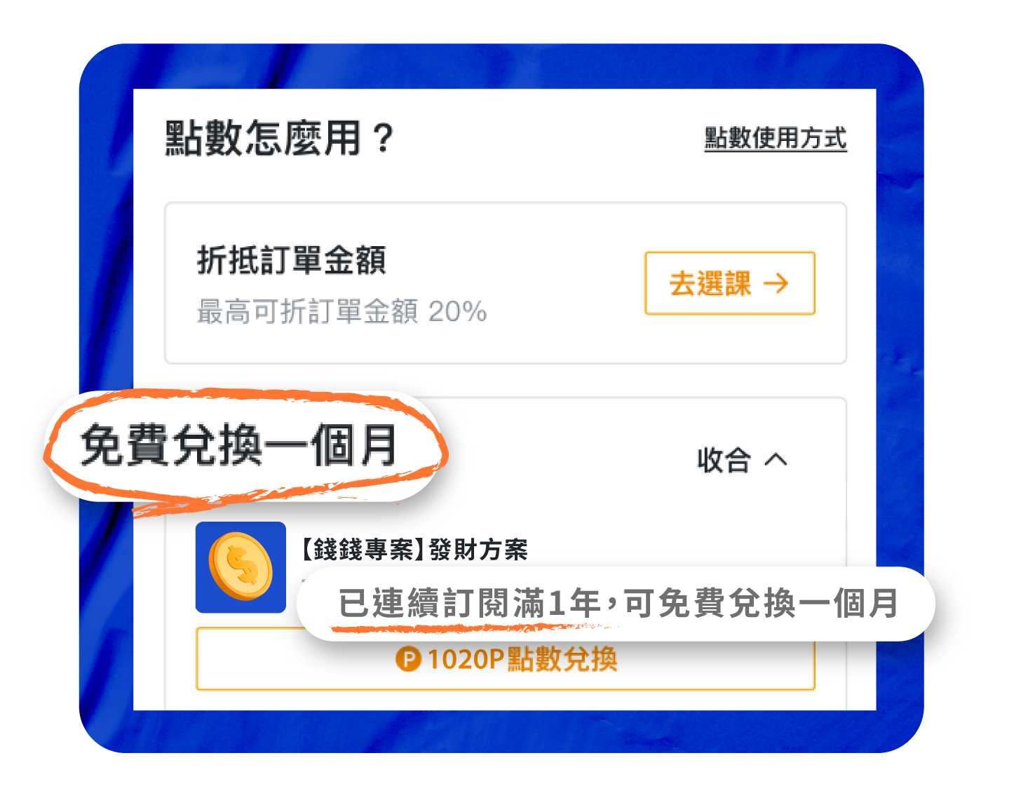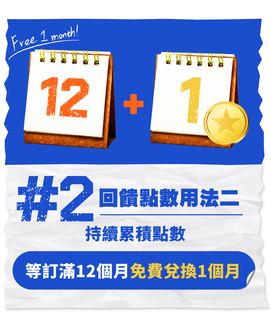 若小明連續訂閱同一方案12個月,共獲得1020點數,這時小明可以選擇用累積的點數折抵1個月訂閱費