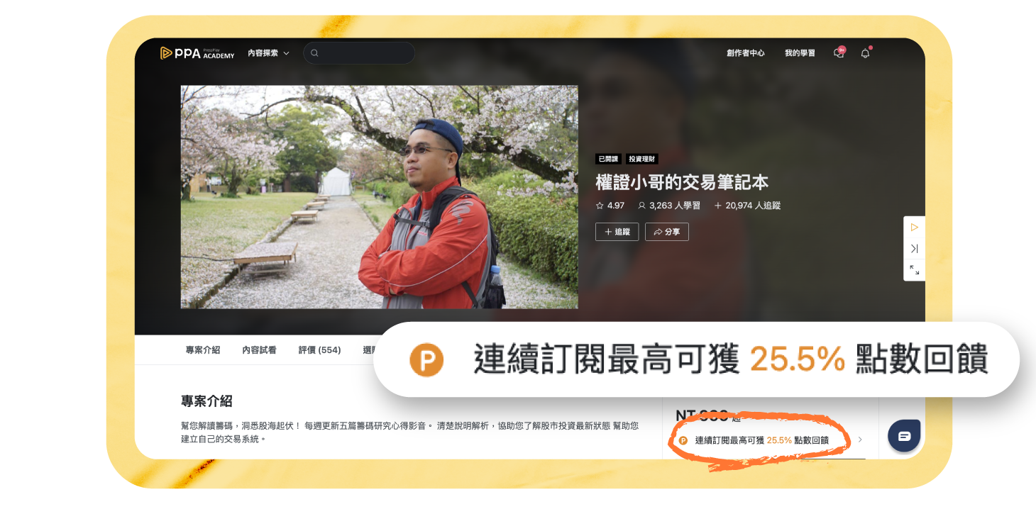 不是每個訂閱專案都有提供訂閱點數回饋,專案介紹頁上有顯示訂閱點數回饋才有喔!